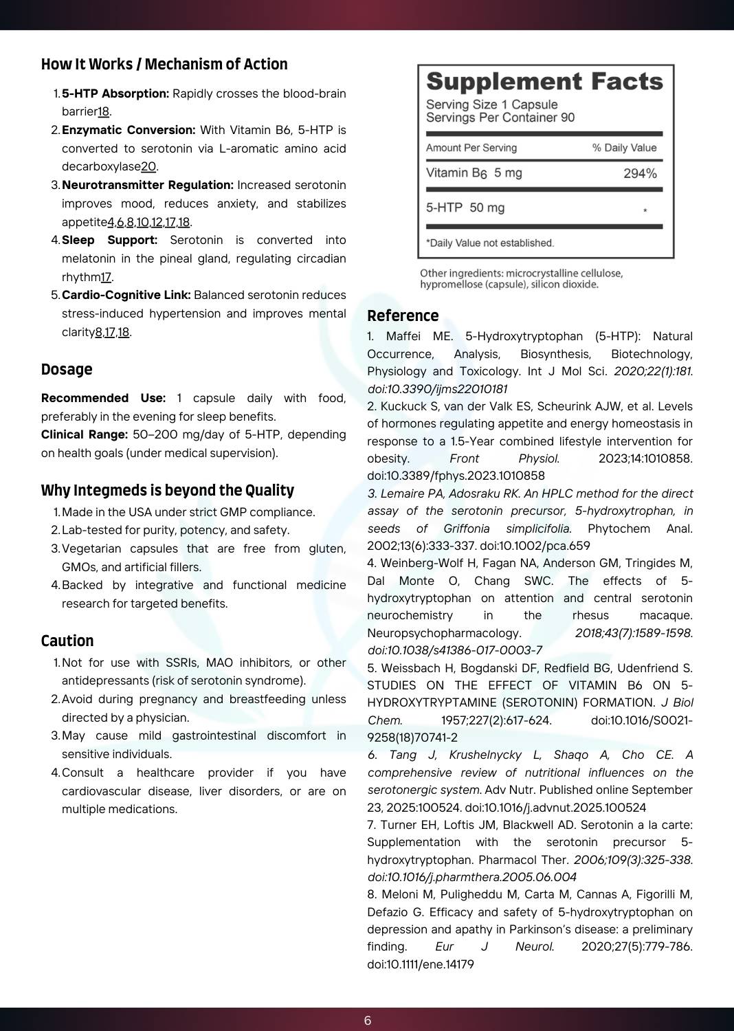 5-HTP is a natural compound derived from the amino acid tryptophan and is a direct precursor to serotonin – the “feel-good” neurotransmitter that helps regulate mood, sleep, stress, and appetite. By pairing it with Vitamin B6, this formula ensures optimal serotonin production, promoting emotional well-being and relaxation.