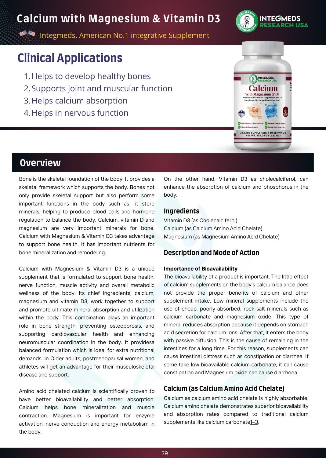 Calcium with Magnesium & D3 is a premium USA-made dietary supplement designed to support strong bones, healthy joints, and overall wellness. This carefully formulated blend combines highly absorbable calcium and magnesium amino acid chelates with Vitamin D3 to enhance calcium absorption and promote optimal skeletal and muscular health. Recommended by Dr. Haque, this supplement also supports nerve function, energy production, sleep quality, and mental health.