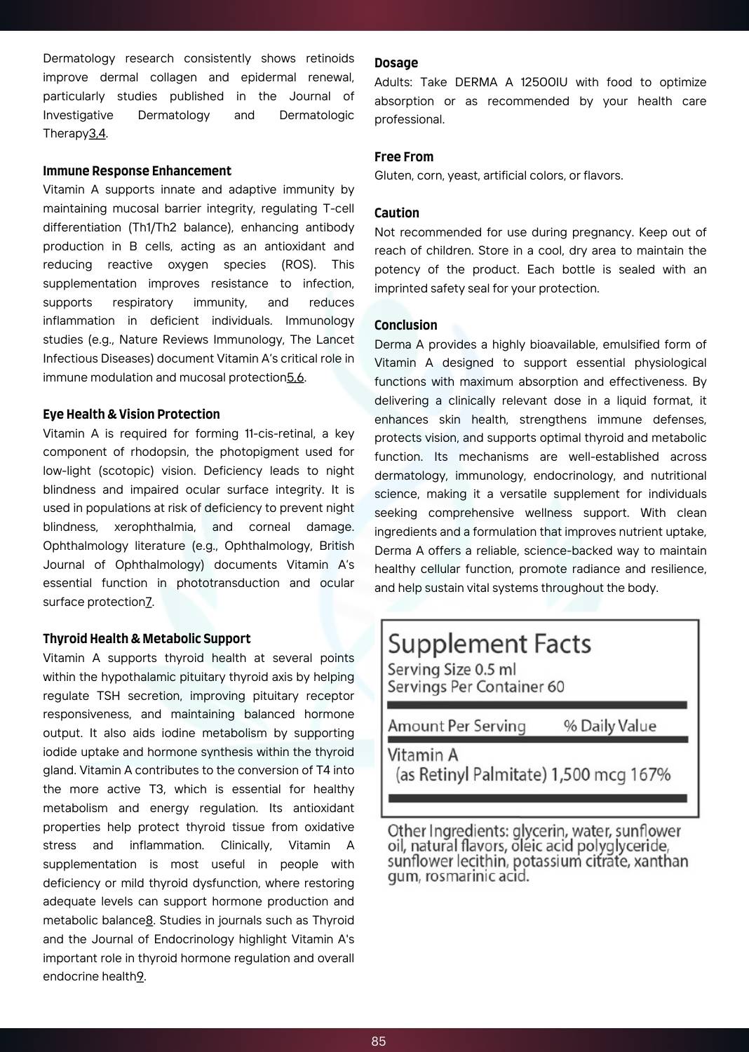 DERMA A 12500IU is a highly absorbable form of Vitamin A, delivered in an emulsified solution to improve its uptake and assimilation by the body. Each drop provides 2,000 IU of Vitamin A as palmitate, a crucial nutrient for maintaining healthy skin, supporting the immune system, and promoting good vision. Vitamin A’s key roles extend to prenatal health, cellular function, and overall skin integrity, making it an essential supplement for skin health and general well-being.