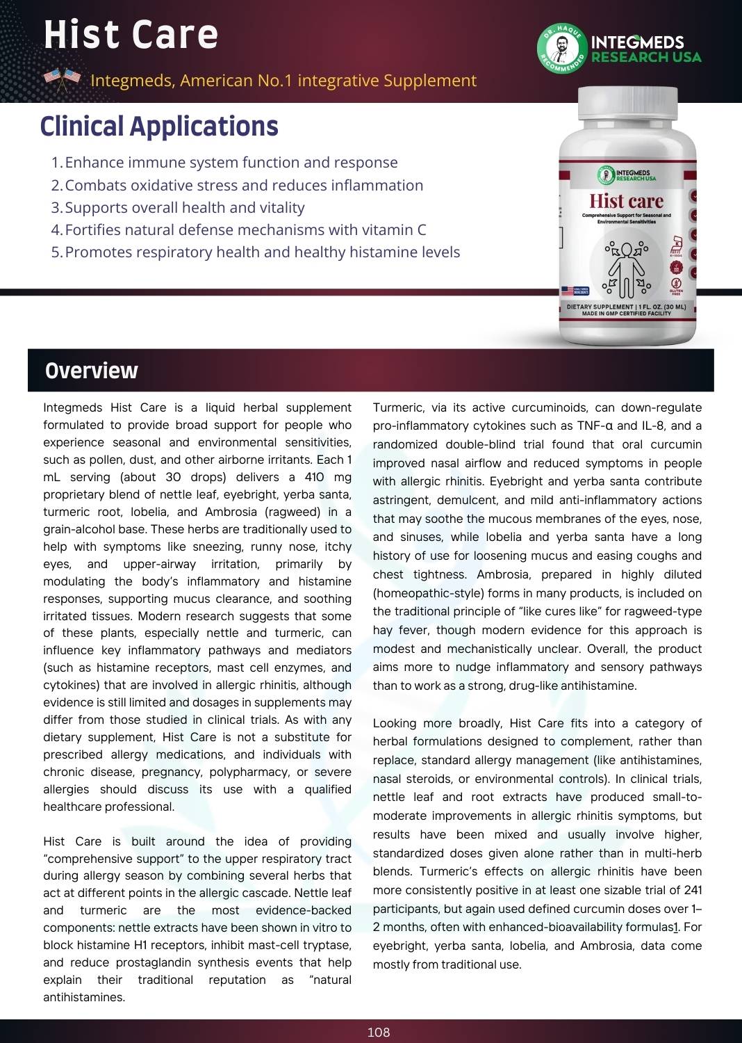 Integmeds Hist Care is a comprehensive immune support supplement, expertly formulated with a synergistic blend of Vitamin C, quercetin, bromelain, stinging nettle leaf, and other vital nutrients to help strengthen the immune system and promote overall wellness.