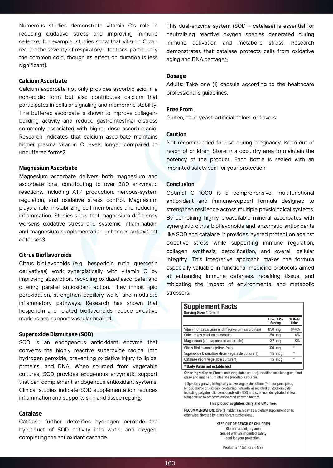 Optimal C 1000 offers a carefully balanced blend of vitamin C and bioflavonoids, providing immune and antioxidant support essential for maintaining overall wellness. The formula is enhanced with Superoxide Dismutase (SOD) and Catalase from vegetable sources, two enzymes known for their ability to further defend against oxidative stress. By using calcium and magnesium ascorbates, this supplement is easy on the stomach, even at higher doses, making it ideal for individuals sensitive to regular ascorbic acid.