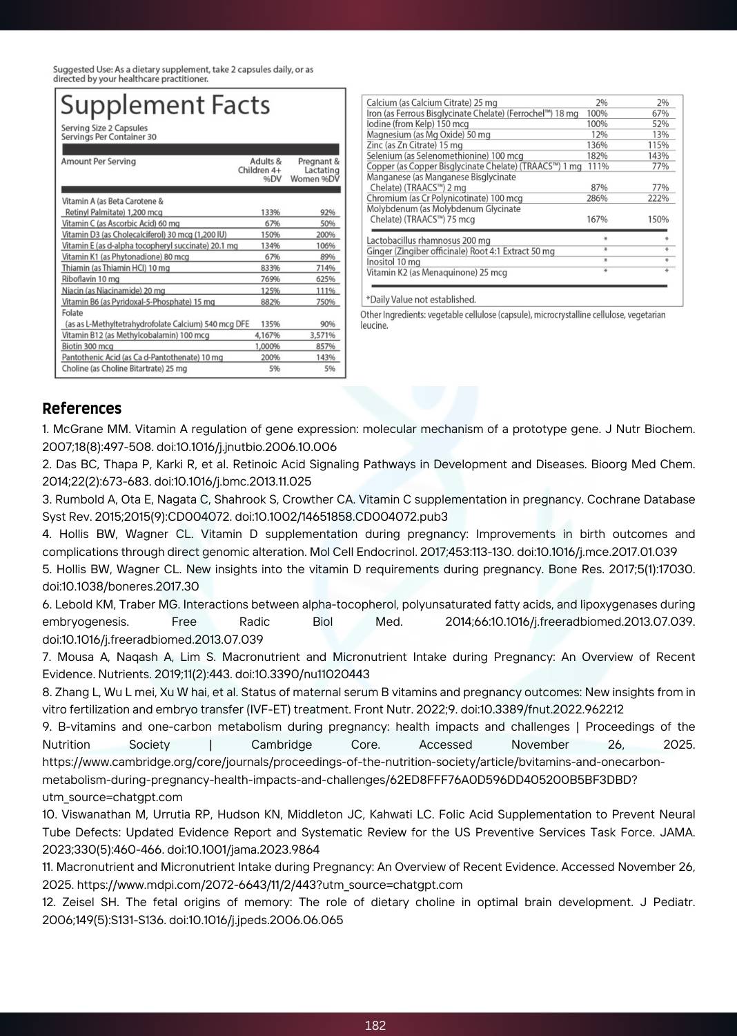 Each serving delivers a complete spectrum of methylated, bioavailable nutrients for better absorption, including L-Methylfolate, Methylcobalamin (B12), and Chelated Minerals (TRAACS™). It also includes probiotics (Lactobacillus rhamnosus) for digestive wellness, ginger root extract for nausea relief, and choline & inositol to support brain and nervous system development in the baby.